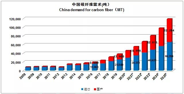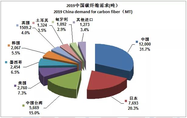 2019年中國碳纖維的總需求為:37,840噸,對比2018年的31,000噸,同比增長了22%,其中,進(jìn)口量為25,840噸(占總需求的68%,比2018增長了17.5%),國產(chǎn)纖維供應(yīng)量為12,000噸(占總需求的31.7%,比2018年增長了33%),2019年的中國市場的總體情況是:供不應(yīng)求,無論是進(jìn)口還是國產(chǎn)纖維。