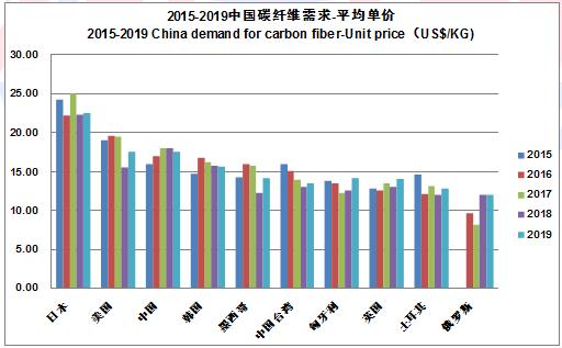 這是向中國銷售碳纖維及中間制品(預(yù)浸料+織物)的各國的價(jià)格水平。我們可以看到,日資及其韓國工廠的價(jià)格依然是最高的,美國的價(jià)格,是由于出口高性能預(yù)浸料與織物而拉高,其主流的出口產(chǎn)品是ZOLTEK的大絲束,與墨西哥、匈牙利是類似的。中國的價(jià)格,從2018年的18美元調(diào)低到2019的17.5美元,這是兼顧了高價(jià)格的航空航天應(yīng)用碳纖維。