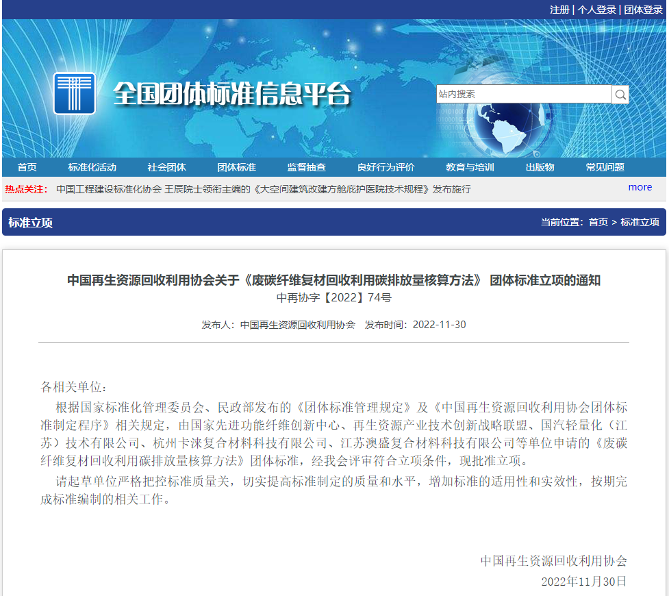 為高質(zhì)量完成《廢碳纖維復(fù)材回收利用碳排放量核算方法》團(tuán)體標(biāo)準(zhǔn)編制工作,確保該標(biāo)準(zhǔn)科學(xué)適用,貼近行業(yè)特點(diǎn)及實(shí)際需求,更具專(zhuān)業(yè)性、實(shí)用性和可操作性,需碳纖維復(fù)材生產(chǎn)、回收、利用等產(chǎn)業(yè)鏈骨干企業(yè)、高等院校、科研機(jī)構(gòu)、環(huán)保、檢測(cè)及認(rèn)證機(jī)構(gòu)等相關(guān)方代表參與。本標(biāo)準(zhǔn)將貫徹落實(shí)《2030年前碳達(dá)峰行動(dòng)方案》《建立健全碳達(dá)峰碳中和標(biāo)準(zhǔn)計(jì)量體系實(shí)施方案》等文件精神,建立與完善廢碳纖維復(fù)材回收利用碳排放量核算標(biāo)準(zhǔn)體系和核算方法,提升行業(yè)碳核算數(shù)據(jù)精準(zhǔn)度,填補(bǔ)行業(yè)碳排放核算標(biāo)準(zhǔn)空白,為切實(shí)有效地參與各項(xiàng)雙碳相關(guān)工作提供科學(xué)依據(jù)和方法準(zhǔn)則,以實(shí)際行動(dòng)貫徹落實(shí)我國(guó)碳達(dá)峰、碳中和重大戰(zhàn)略決策。現(xiàn)公開(kāi)征集該標(biāo)準(zhǔn)參編單位和人員,有關(guān)事項(xiàng)通知如下: 南通復(fù)源新材料科技有限公司(牽頭)、國(guó)家先進(jìn)功能纖維創(chuàng)新中心、再生資源產(chǎn)業(yè)技術(shù)創(chuàng)新戰(zhàn)略聯(lián)盟、國(guó)汽輕量化(江蘇)技術(shù)有限公司、杭州卡淶復(fù)合材料科技有限公司、江蘇澳盛復(fù)合材料科技有限公司、江蘇亨睿碳纖維科技有限公司、江蘇集萃碳纖維及復(fù)合材料應(yīng)用技術(shù)研究院有限公司、江蘇天鳥(niǎo)高新技術(shù)股份有限公司、連云港神鷹復(fù)合材料科技有限公司、上海第二工業(yè)大學(xué)、上海交通大學(xué)、上海碳纖維復(fù)合材料創(chuàng)新研究院有限公司、勝利新大新材料股份有限公司、威海光威復(fù)合材料股份有限公司、中國(guó)科學(xué)院寧波材料技術(shù)與工程研究所、中國(guó)石化上海石油化工股份有限公司(征集完善中……)(一)碳纖維復(fù)材生產(chǎn)、回收、利用企業(yè)、事業(yè)單位、高等院校、科研院所、環(huán)保、檢測(cè)及認(rèn)證機(jī)構(gòu)等具有獨(dú)立法人資格單位,具有行業(yè)代表性以及較高的制造和科研水平。(二)申報(bào)單位重視標(biāo)準(zhǔn)化工作,具有參與本標(biāo)準(zhǔn)研制的相關(guān)工作基礎(chǔ)。(三)申報(bào)單位近三年(含成立不足三年)未發(fā)生較大及以上的安全、環(huán)保、質(zhì)量等事故。(四)參與標(biāo)準(zhǔn)人員應(yīng)熟悉行業(yè)及標(biāo)準(zhǔn)化相關(guān)工作,具有豐富的實(shí)踐經(jīng)驗(yàn)和較高的理論水平,并能夠參與標(biāo)準(zhǔn)起草的各項(xiàng)工作,按時(shí)完成標(biāo)準(zhǔn)起草組分配的各項(xiàng)工作任務(wù)。(五)愿意承擔(dān)開(kāi)展標(biāo)準(zhǔn)化工作所需的技術(shù)、人力、資金支持。四、參編單位、參編人員的權(quán)利和義務(wù)(一)參與標(biāo)準(zhǔn)制定,成為標(biāo)準(zhǔn)起草組成員,并在標(biāo)準(zhǔn)發(fā)布文本中體現(xiàn)參編單位名稱和參編人員姓名(原則上每單位限定為1 人)。(二)本標(biāo)準(zhǔn)升級(jí)成國(guó)家標(biāo)準(zhǔn)、國(guó)家生態(tài)環(huán)境標(biāo)準(zhǔn)、行業(yè)標(biāo)準(zhǔn)或修訂時(shí),優(yōu)先享有參與本標(biāo)準(zhǔn)制修訂工作的權(quán)利。(三)授予標(biāo)準(zhǔn)參編單位和參編人員榮譽(yù)稱號(hào),并頒發(fā)企業(yè)參編單位銅牌、參編人員榮譽(yù)證書(shū)。(四)參編單位和參編人員應(yīng)積極承擔(dān)、合作完成標(biāo)準(zhǔn)起草工作組安排的各項(xiàng)工作,在標(biāo)準(zhǔn)起草過(guò)程中提供的信息真實(shí)、客觀、科學(xué)。五、申報(bào)時(shí)間節(jié)點(diǎn) 本團(tuán)體標(biāo)準(zhǔn)的研制,不僅有利于引導(dǎo)行業(yè)的高質(zhì)量發(fā)展,也有利于保持骨干企業(yè)、高校和科研機(jī)構(gòu)在本領(lǐng)域的競(jìng)爭(zhēng)力和領(lǐng)先優(yōu)勢(shì),請(qǐng)有意向參與本標(biāo)準(zhǔn)起草的相關(guān)企事業(yè)單位認(rèn)真填寫(xiě)《中國(guó)再生資源回收利用協(xié)會(huì)團(tuán)體標(biāo)準(zhǔn)編寫(xiě)申請(qǐng)表》(詳見(jiàn)附件),并于2022年12月30日下班前將簽字蓋章后的申報(bào)表反饋至再生資源產(chǎn)業(yè)技術(shù)創(chuàng)新戰(zhàn)略聯(lián)盟秘書(shū)處聯(lián)系人郵箱并電話確認(rèn)。六、聯(lián)盟秘書(shū)處聯(lián)系方式:地址:北京市東城區(qū)法華寺街91號(hào)5號(hào)樓(100061)